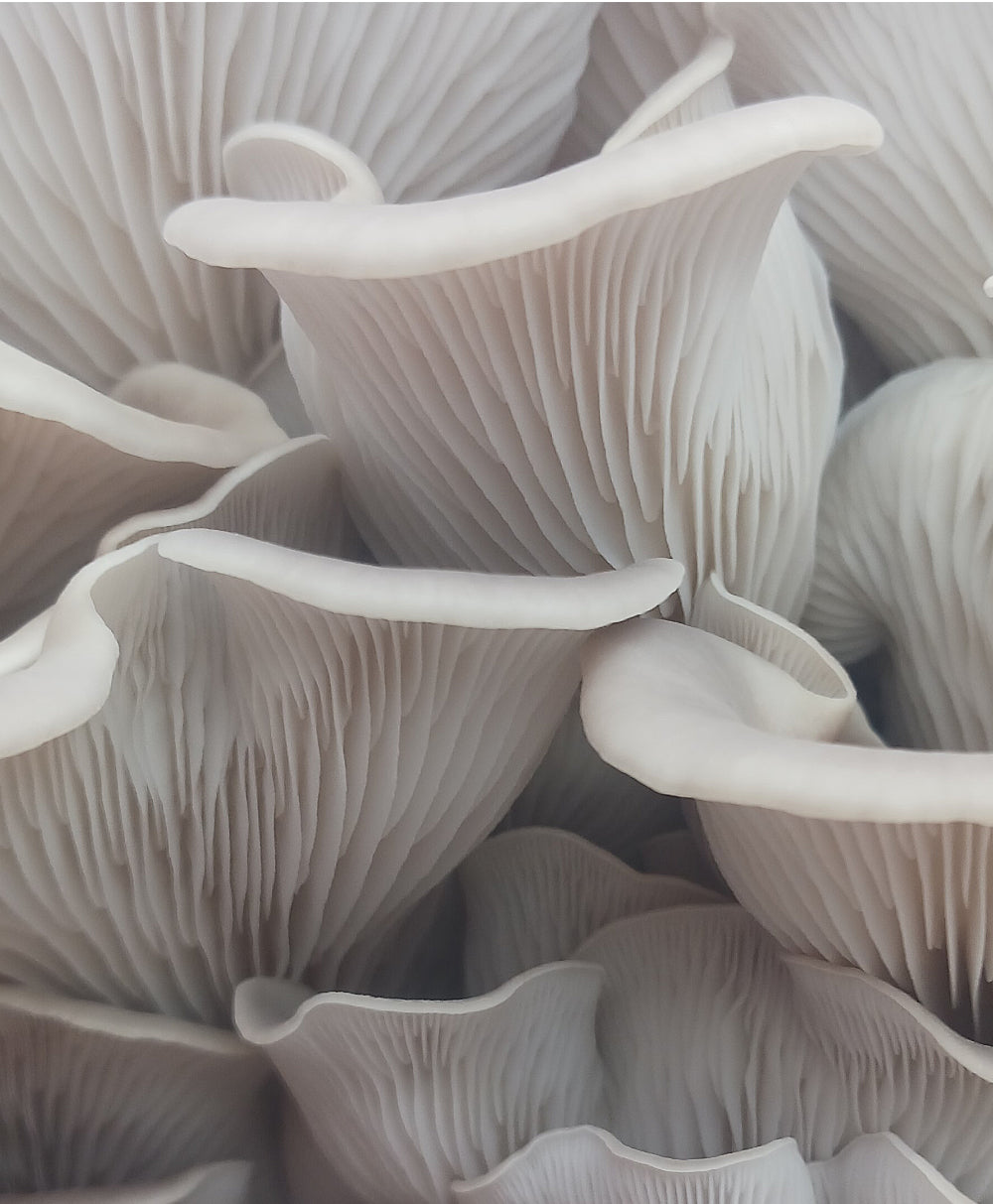 Thicker and meatier than Blue and Golden varieties, Italian Oyster mushrooms share resemblance and nutritional content with the common Oyster mushroom. A single Italian Oyster mushroom can grow as large as person’s hand, which makes them ideal for sandwiches. They are also softer, have sturdier caps, and are a convincing meat substitute for many dishes