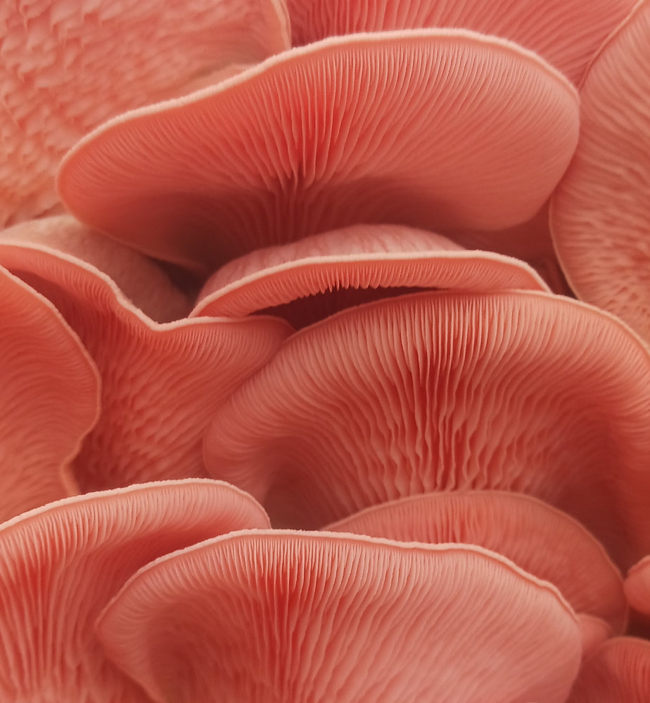 Pink Oyster mushrooms are a dense/meaty mushroom that can be found growing naturally in tropical climates. They are a good source of amino acids, vitamin C, potassium, riboflavin, vitamins B3-B5-B6, folic acid, and magnesium. Pink Oyster mushroom flavor is savory/umami, similar to other Oyster varieties. They can be prepared as a bacon or ham substitute, or used in any dish that calls for mushrooms.